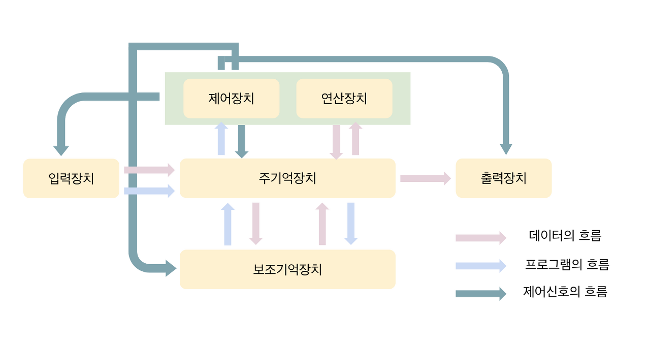 하드웨어의 구성은 각 화살표는 시스템 버스(SystemBus)라 한다.