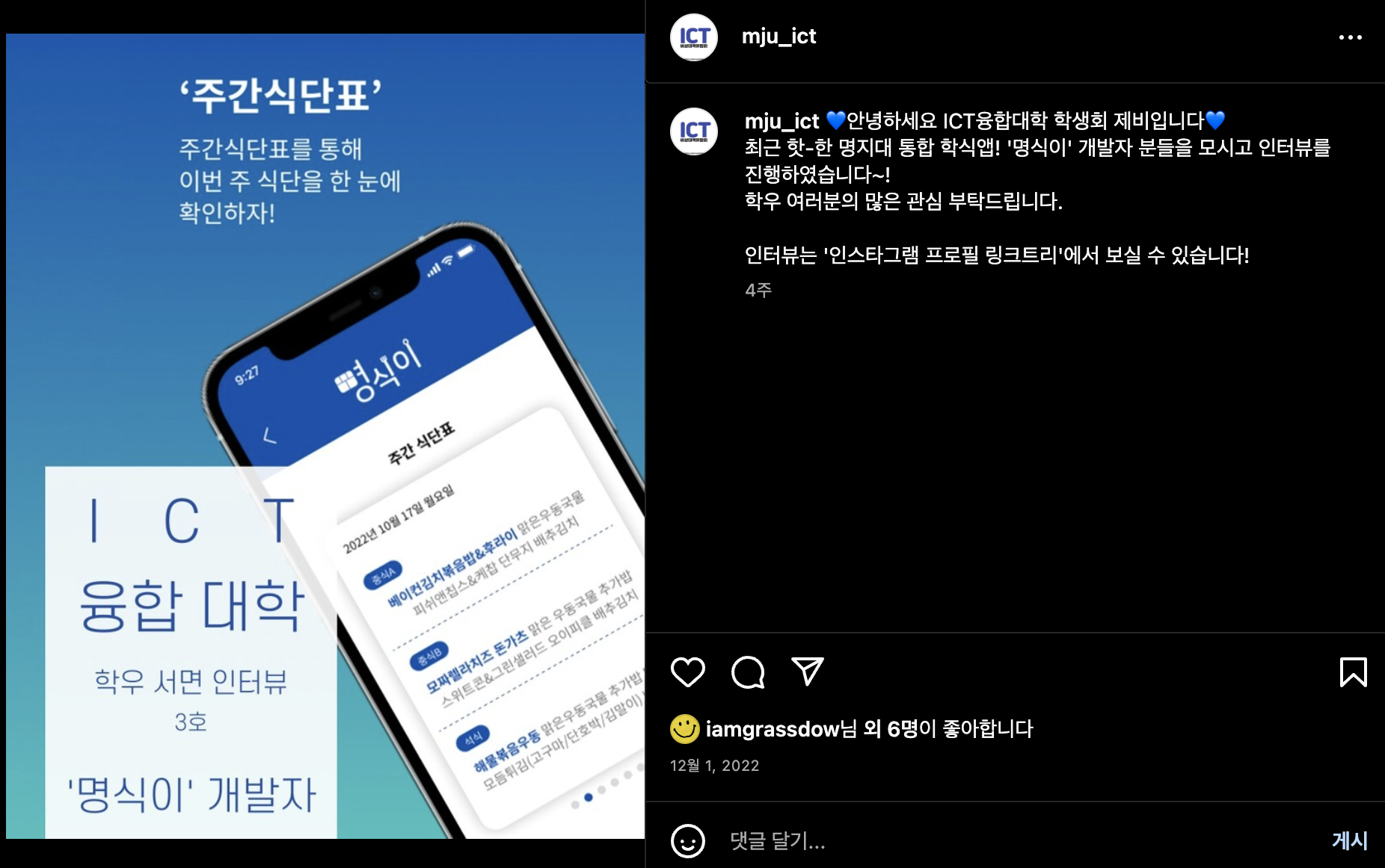 명식이는 "명지대학교의 식사를 책임지다!"를 슬로건을 가지고 출발한 앱이다. 첫 시작은 인문 캠퍼스 공사를 거치며 학생식당이 신규로 들어오며 기존의 학식메뉴를 제공해주는 에브리타임에서는 제공하지 않고 학생들은 직접 학생식당에 가서 사진을 찍고 이를 에브리타임 커뮤니티에서 공유하여 많은 학생들이 불편함을 느끼는 것을 들었다. 안드로이드 친구와 학생식당 메뉴를 알려주는 앱을 만들자는 의견에서 시작했다. 시작을 하기로 마음을 먹고 1주일 만에 개발을 마치고 배포를 진행했다.