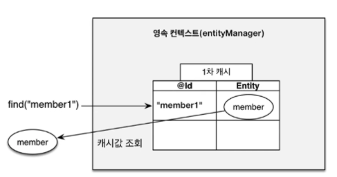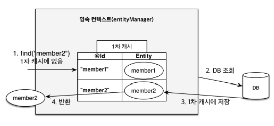 1차캐시에서 찾아봤는데 없으면 DB에 조회를 한 후 1차캐시에서 저장한 다음 캐시에서 반환을 한다.