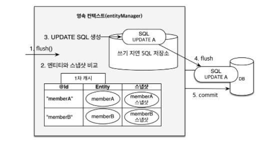- 쓰기 지연 SQL 저장소의 쿼리를 데이터베이스에 전송(등록, 수정, 삭제 쿼리)