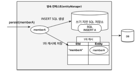 영속성 컨텍스트 안에는 쓰기 지연 SQL 저장소가 존재하는데 memberA에 대해서 INSERT문을 생성해두고 그러면서 1차 캐시에 저장한다.