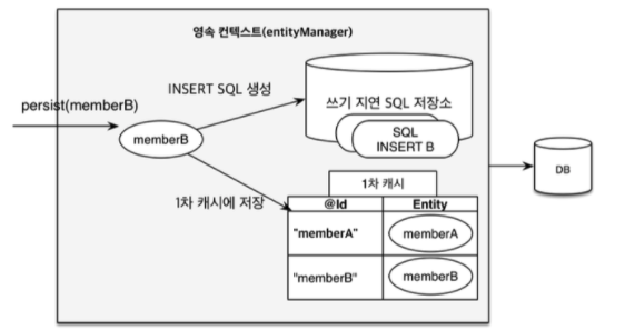 - 쓰기 지연 SQL 저장소의 쿼리를 데이터베이스에 전송(등록, 수정, 삭제 쿼리)