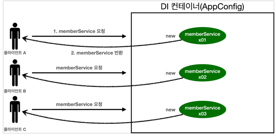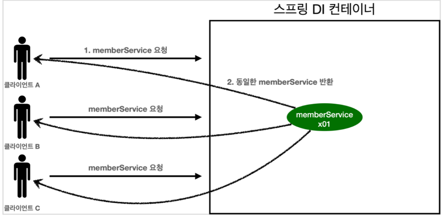 스프링 컨테이너 덕분에 고객의 요청이 올 때 마다 객체를 생성하는 것이 아니라, 이미 만들어진 객체를 공유해서 효율적으로 재사용할 수 있다.