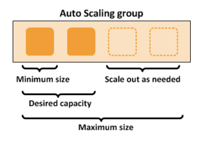 AWS는 특정 시점에 네트워크 정보와 시스템 리소스 메트릭 정보들을 모니터링 서비스로 수집한 이후, 사용자가 지정한 일정 임계치를 넘어가면 오토스케일링 그룹으로 알림을 발송해 서버수를 늘리거나 줄이는 방식으로 작동한다. 위의 사진과 같이 최소 사이즈 단위를 규정하고 디폴트 성능을 정하고 디폴트 성능을 초과하면 Scale out이 필요하다는 것을 알림 보내는 방식이다.