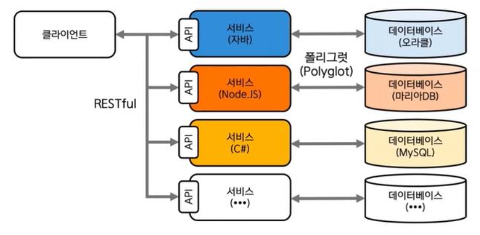 위의 사진을 보면 각각의 클라이언트에서 각각의 다른 서비스에서 다른 DB를 통해 하나의 시스템을 완성하는 것을 볼 수 있다.