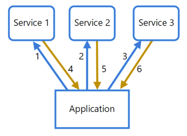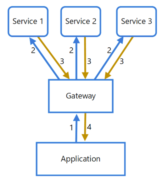 위의 상황은 Application과 service사이에 API gatway를 두어서, 요청을 동시에 service1,2,3에 보낸 후, 데이터를 취합하여 다시 클라이언트로 보낸다. API Gateway를 두어서 하나의 api point만 알아도 되는 이점이 있다.