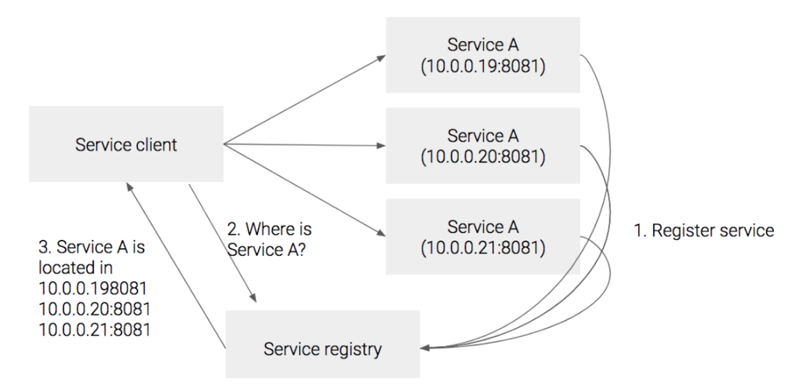 Service A의 인스턴스들이 생성될때, Service A에 대한 주소를 Servie registry(서비스 등록 서버)에 등록해놓는다. Service A를 호출하고자 하는 클라이언트는 Service registry에 Service A의 주소를 물어보고 등록된 주소를 받아서 그 주소로 서비스를 호출한다.