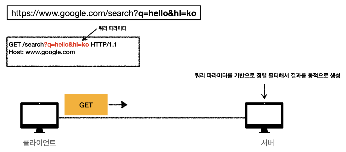 - GET은 쿼리 파라미터 사용해서 데이터를 전달한다.