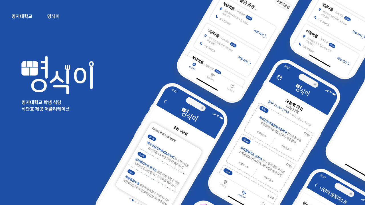 명식이는 "명지대학교의 식사를 책임지다!"를 슬로건을 가지고 출발한 앱이다. 첫 시작은 인문 캠퍼스 공사를 거치며 학생식당이 신규로 들어오며 기존의 학식메뉴를 제공해주는 에브리타임에서는 제공하지 않고 학생들은 직접 학생식당에 가서 사진을 찍고 이를 에브리타임 커뮤니티에서 공유하여 많은 학생들이 불편함을 느끼는 것을 들었다. 안드로이드 친구와 학생식당 메뉴를 알려주는 앱을 만들자는 의견에서 시작했다. 시작을 하기로 마음을 먹고 1주일 만에 개발을 마치고 배포를 진행했다.